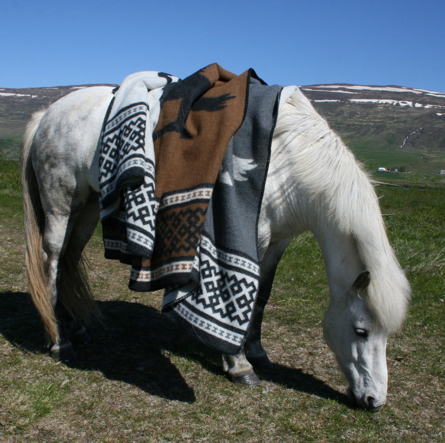 Mjúk og hlý ullarteppi með fallegu íslensku mynstri. Fáanlegt með Hesta mynstri eða Blómi Lífsins