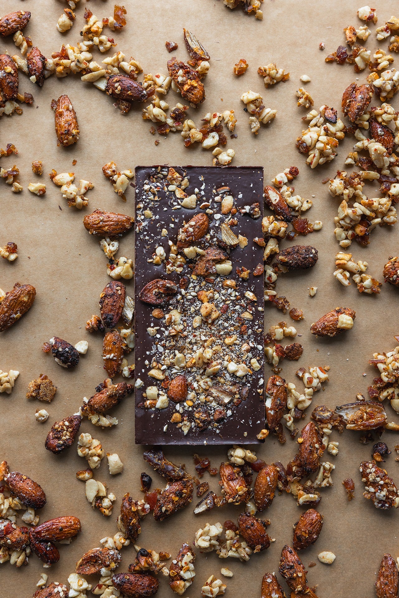 Dökkt súkkulaði með krydduðum Kasjúhnetum, möndlum og döðlum.