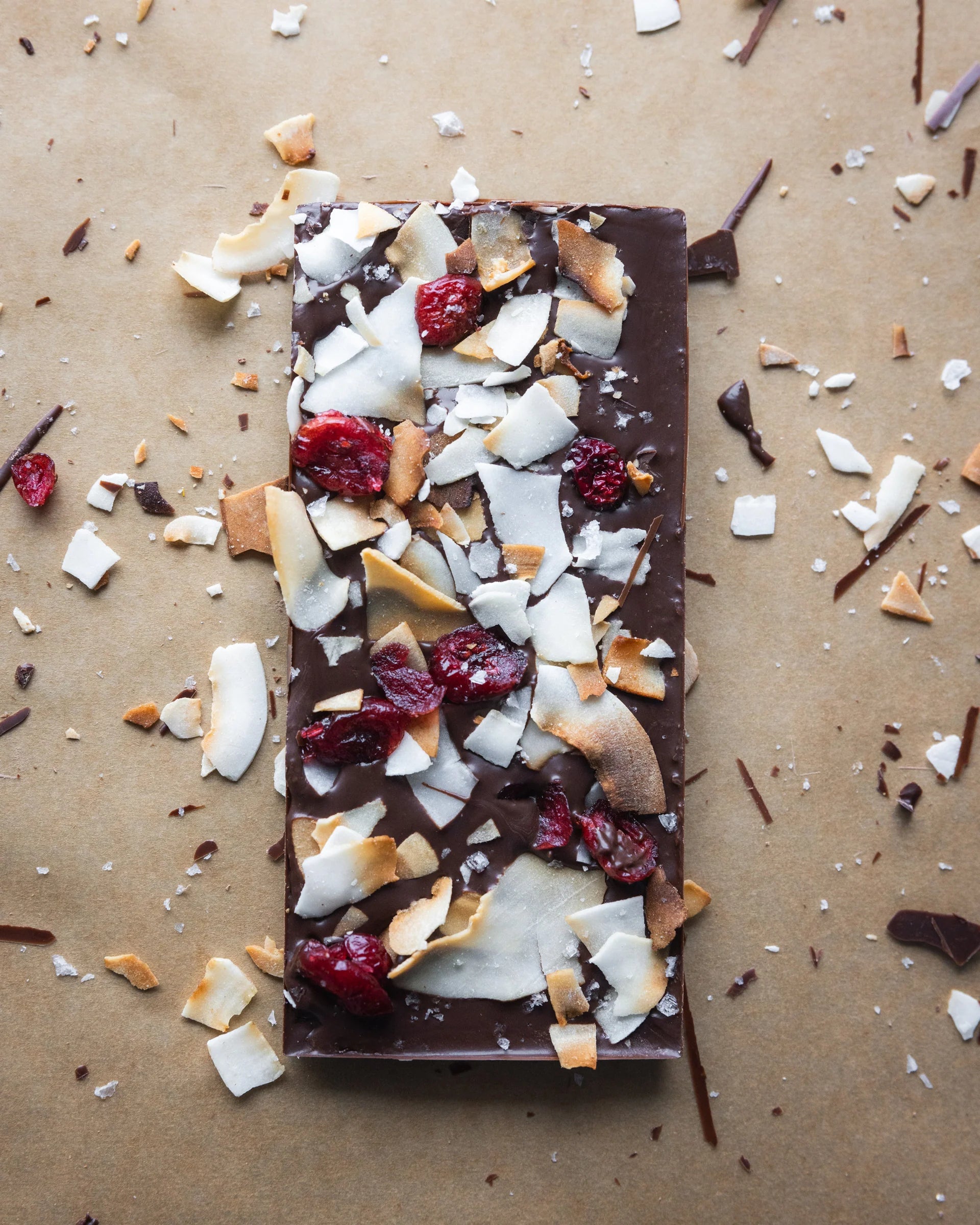 Dökkt súkkulaði með karamelluristuðum kókos, trönuberjum og sjávarsalti